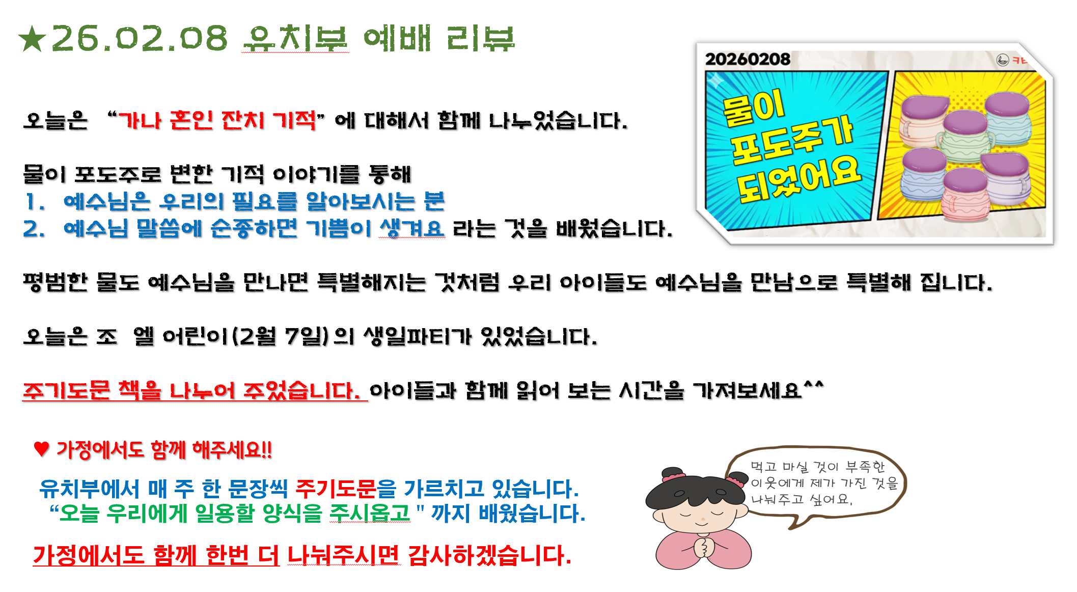 1. 환영합니다. 주일예배에 오신 모든 분들을 주님의 이름으로 환영합니다. 다과가 준비되어 있습니다. 함께 교제하시기 바랍니다. 2. 등록 안내 : 등록을 원하시는 분은 등록카드(안내데스크)를 작성하셔서 헌금함에 넣어 주시기 바랍니다. 3. 새가족 소개 : 임ㅇ택/양ㅇ현(ㅇ성) 가재마을4단지 4. 태국 단기선교 : 4일(수)∼11일(수), 방콕 및 우돈타니 지역 선교팀 : 정ㅇ재(인솔) 문ㅇ인(팀장) 김ㅇ순 김ㅇ기 김ㅇ순 송ㅇ기 안ㅇ숙 이ㅇ숙 허ㅇ예 (태국 선교물품은 오늘까지 수집) 5. 새생명축제 준비위 : 오늘 오후 1시 15분, 목양실 (새생명 축제 : 4월 26일(주일), 나무엔 찬양 콘서트) 6. 청년부 수련회 : 1월 31일(토)∼오늘까지, 학림재(장군면), 주제 : 회고 7. 청소년부 수련회 : 6일(금)∼7일(토), 대청호 펜션, 주제: 승리의 파티 8. 우리 가족을 위한 AI 강의 : 다음 주일 오후 1시 10분, 예배실 강사-손ㅇ권 성도(더 밀크 대표, 스탠퍼드대 방문연구원) (베트남 목장·문화선교팀 주관) 9. 비폭력 대화 강좌(전문강사 특강) : 21일(토)∼3월 14일(토) 4주간 토요일 (자세한 것은 게시판 포스터를 참고하세요. 문의 민ㅇ주 안수집사)10. VIP를 위한 선물(커피 드립백) : 1박스(4개 드립백), 2천원11. 장례 : 김ㅇ문 선생(김 ㅇ 집사 부친/정ㅇ선 집사 시부), 1월 26일(월) 소천12. 대접 : 김 ㅇ/정ㅇ선 집사, 아버지 장례를 마치고 떡을 대접.13. 차량운행 봉사자 모집 : 2부 예배 차량 운행(1종 면허증 소지자)14. 다음 주일 교회 청소 봉사 : 인도 목장입니다.