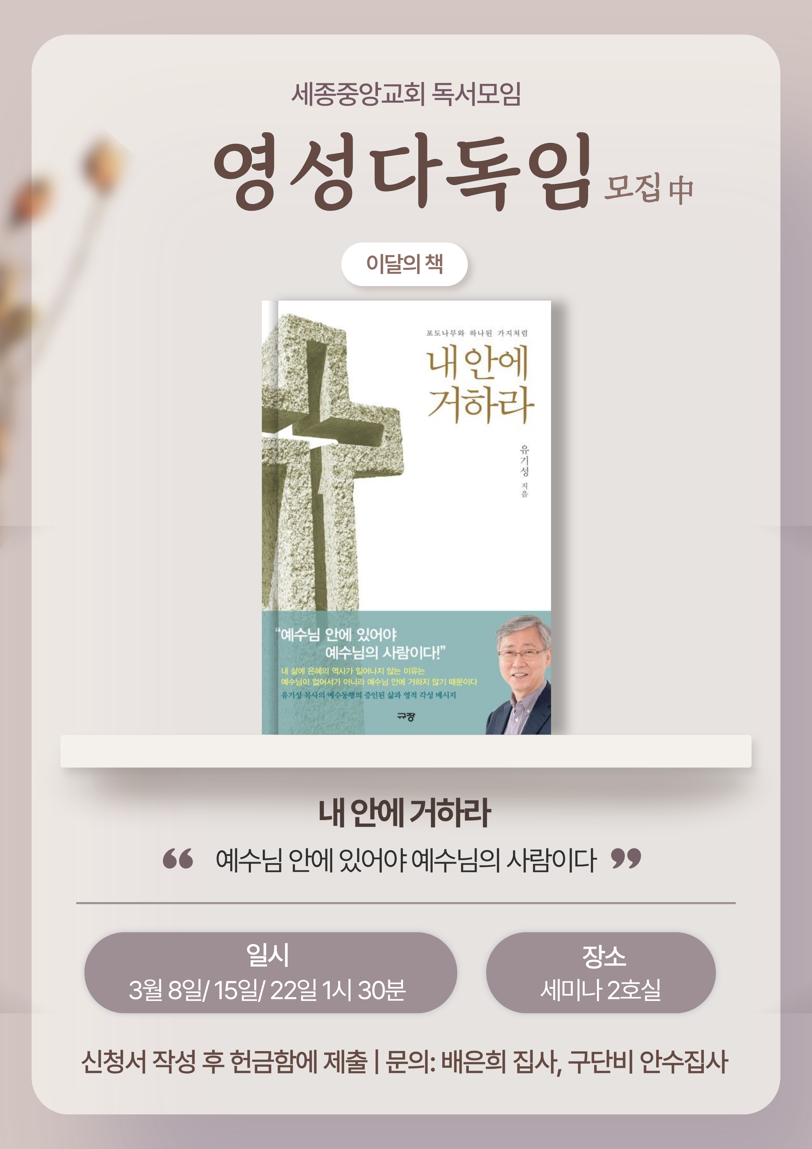 1. 환영합니다. 주일예배에 오신 모든 분들을 주님의 이름으로 환영합니다. 다과가 준비되어 있습니다. 함께 교제하시기 바랍니다. 2. 등록 안내 : 등록을 원하시는 분은 등록카드(안내데스크)를 작성하셔서 헌금함에 넣어 주시기 바랍니다. 3. 청년주일 : 오늘은 청년주일로 드렸습니다. 예배를 섬겨주신 청년부에게 감사드립니다. ·청년부 교역자 : 명주영 목사 ·청년부 지도교사 : 강ㅇ부 장로(팀장), 김ㅇ주, 김ㅇ숙, 문ㅇ주, 양ㅇ금, 홍ㅇ현 ·청년부 임원 : 유ㅇ민(회장), 문ㅇ영(부회장), 윤ㅇ운(회계), 윤ㅇ준(찬양팀장), 유ㅇ영·최ㅇ인(홍보팀장) 4. 환우와 선교지를 위한 릴레이 금식기도 : 환우와 목장 선교지를 위해 하루 한 끼 금식하며 기도할 중보기도자를 모집합니다. ·기간 : 3월 1일(주일) 아침∼3월 21일(토) 저녁 ·참여 방법 : ‘릴레이 금식 기도표’의 원하는 날짜에 이름 기재. ·문의 : 이ㅇ옥 안수집사(자카르타 목장 목자) 5. 영성 독서모임(영성 다독임) 모집 신앙 서적을 함께 읽고 함께 고민하며 이야기 나누는 모임입니다. ·신청일 : 3월 1일(주일)까지 신청서 작성하여 헌금함에 넣어 주세요. ·모임(3주간) : 3월 8일, 15일, 22일 매주일 오후 1시, 세미나실B ·교재 : 내 안에 거하라 (유기성 목사 저) ·문의 : 배ㅇ희 집사, 구ㅇ비 안수집사 6. 비폭력 대화 강좌② : 28일(토), 오후 1시 7. 새생명축제 준비위 : 다음 주일 오후 1시 20분, 목양실 (새생명축제 : 4월 26일(주일), 나우멘 찬양 콘서트) 8. 교회 요람 업데이트 : 최근 2년 내에 연락처 및 주소가 변경되신 분들은 목자·부목자에게 알려주시기 바랍니다. 9. 차량운행 봉사자 모집 : 2부 예배 차량 운행(1종 면허증 소지자)10. 이사 : 홍ㅇ주 성도(ㅇ람), 24일(화) 수원으로 이사11. 대접 : 윤ㅇ근/장ㅇ정 집사가 범사에 감사하며 떡을 대접12. 다음 주일 교회 청소 봉사 : 북한 목장입니다.