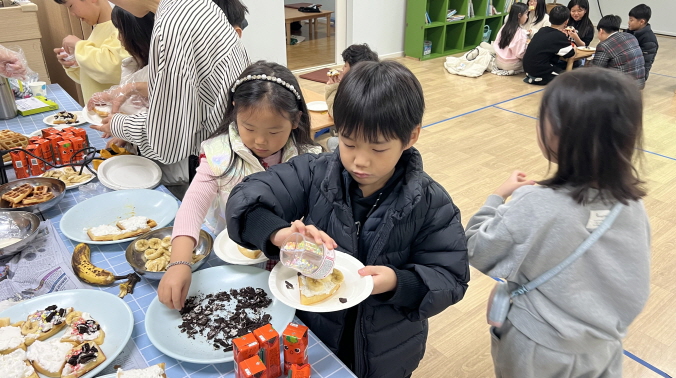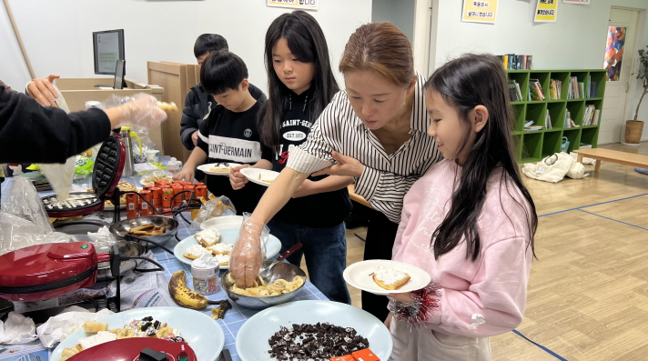 와플을 굽고, 자신의 입맛에 따라 맛있게 만들어 먹었습니다. ^^